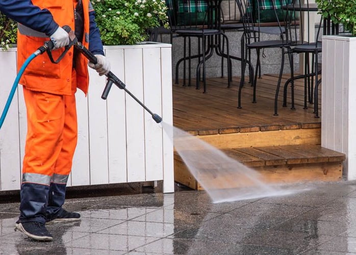 Terrasses et allées nettoyées pour un extérieur accueillant.